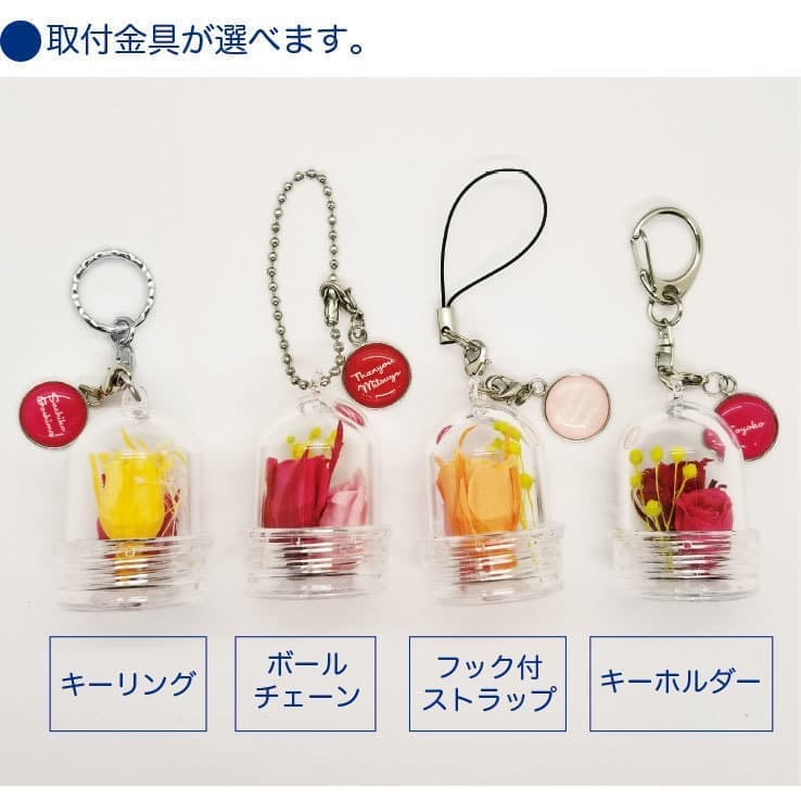 贈る相手のライフスタイルに合わせてキーホルダー、キーリング、ストラップ、ポールチェーンの金具から選んでいただけます。