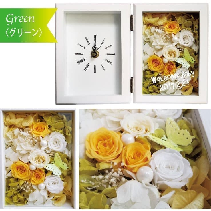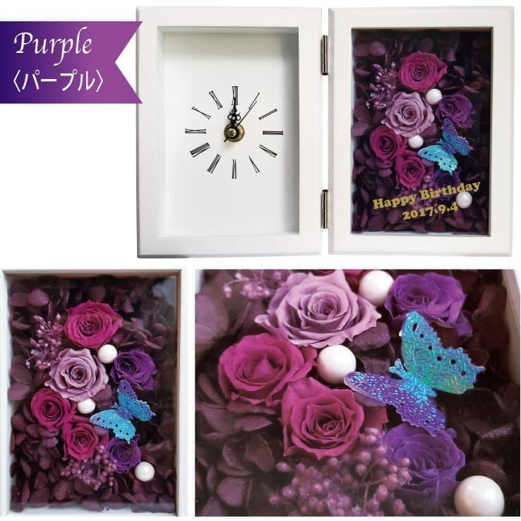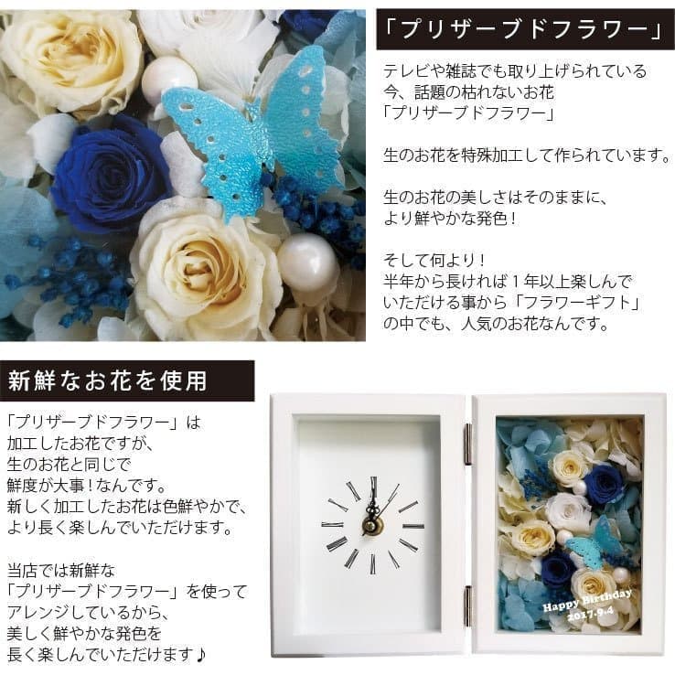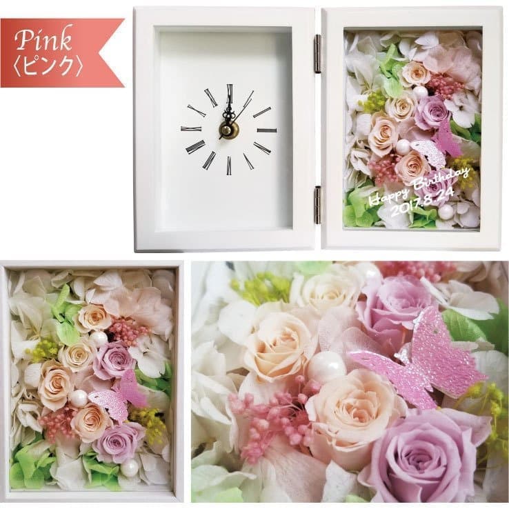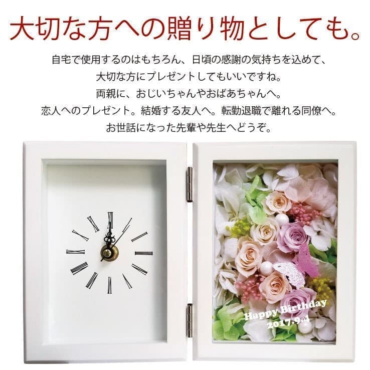 プリザーブドフラワー クロックボックスはプリザーブドフラワー&時計と記念のメッセージを一緒に飾れる優れもの。またギフトとして手渡すときのカタチにまでこだわったフレームは、「メモリアル」ギフトにも最適です。