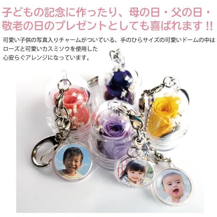 可愛い子供の写真入りチャームがついている、手のひらサイズの可愛いドームの中は