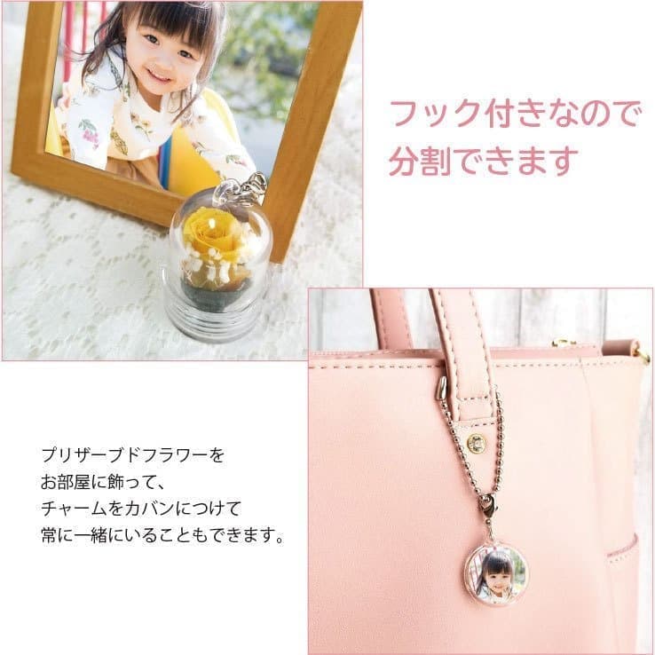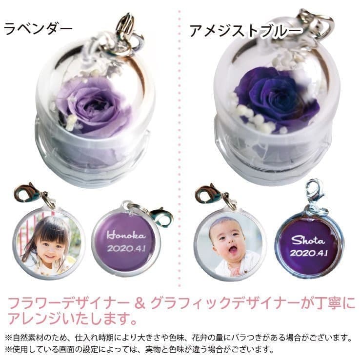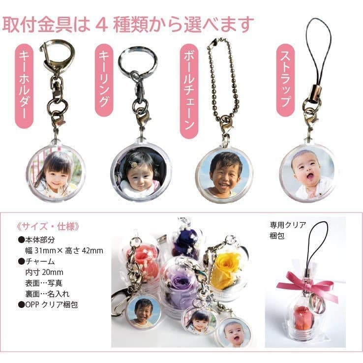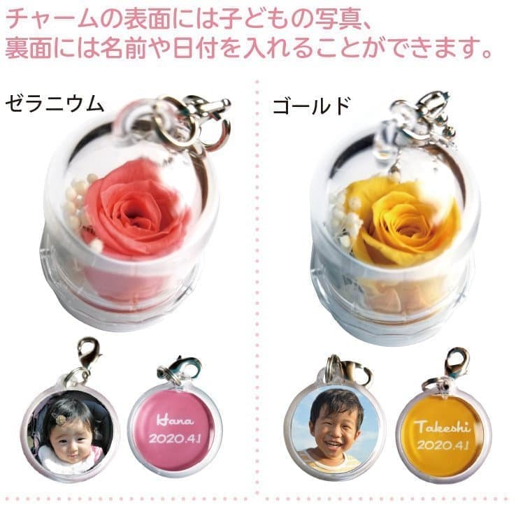 チャームの表面には子どもの写真、裏面には名前や日付を入れることができます。